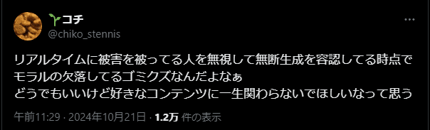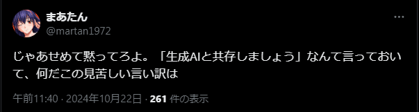 2024年10月21日、著名なイラストレータのさいとうなおき氏が、自身のTwitterで、画像生成AIについて「他に努力すべき事が山ほどあり、時間がもったいないので反AIをやってるヒマがない」とする意見をポスト。